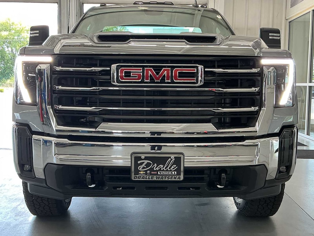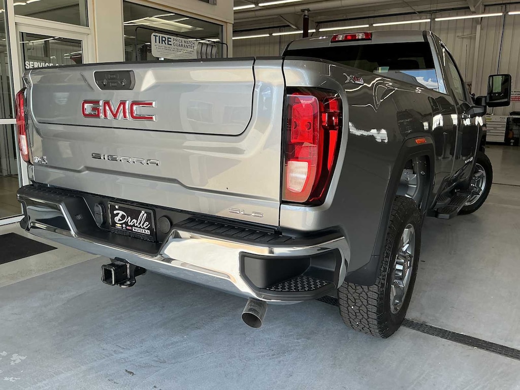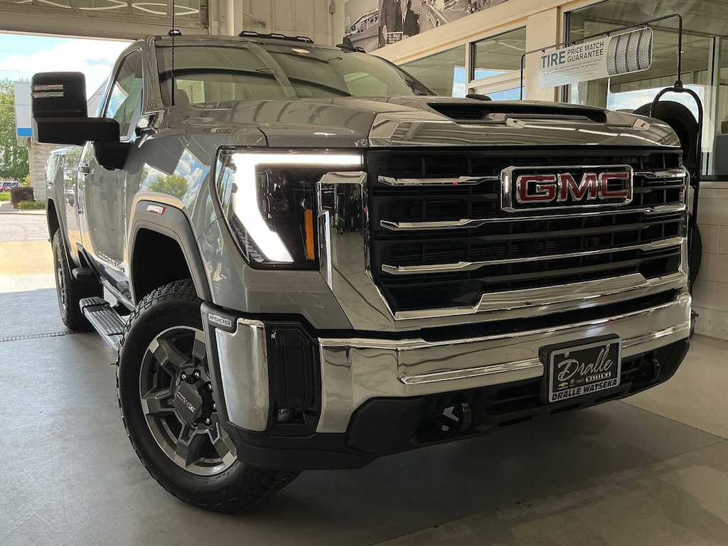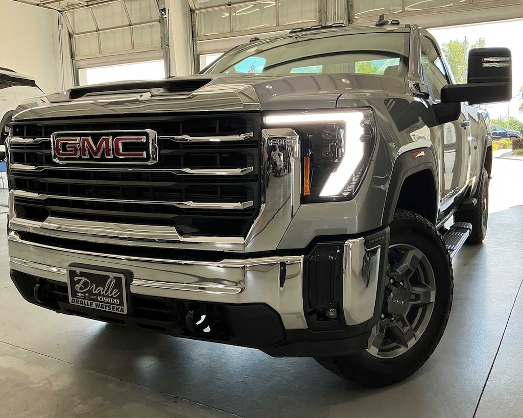 WHEELS, 20" (50.8 CM) BRIGHT FACE WHEELS with dark painted pockets, SLE CONVENIENCE PACKAGE includes (CJ2) dual climate control, (A2X) 10-way power driver seat including power lumbar, (N37) manual tilt/telescoping steering column, (T3U) LED fog lights and (U01) Roof Marker Lamps, LPO, ASSIST STEPS, CHROMED TUBULAR, 6" RECTANGULAR (dealer-installed), BEDLINER, SPRAY-ON, PICKUP BEDLINER with GMC logo (does not include spray-on liner on tailgate due to Black composite inner panel), REMOTE START PACKAGE includes (BTV) Remote Start, (UTJ) content theft alarm and (C49) rear-window defogger, X31 OFF-ROAD PACKAGE includes (JHD) Hill Descent Control, (NZZ) skid plates, Off-Road suspension, Twin-tube Rancho shocks and X31 hard badge Includes (QXT) LT265/70R17E all-terrain, blackwall tires. TAILGATE, GMC MULTIPRO TAILGATE with six functional load/access features NOTE: Auto release can be disabled if ball hitch is installed. See Owner's manual for details, SLE HEATED PACKAGE includes (KA1) heated driver and passenger seats, (KI3) heated steering wheel, AUDIO SYSTEM, 13.4" DIAGONAL PREMIUM GMC INFOTAINMENT SYSTEM WITH GOOGLE BUILT IN APPS SUCH AS NAVIGATION AND VOICE ASSISTANCE includes color touch-screen, multi-touch display, AM/FM stereo, Bluetooth® streaming audio for music and most phones; featuring wireless Android Auto® and Apple CarPlay® capability for compatible phones (STD), ENGINE, 6.6L V8 with Direct Injection and Variable Valve Timing, gasoline, (401 hp [299 kW] @ 5200 rpm, 464 lb-ft of torque [629 N-m] @ 4000 rpm) (STD), TRANSMISSION, 10-SPEED AUTOMATIC (STD). GMC SLE with Sterling Metallic exterior and Jet Black interior features a 8 Cylinder Engine with 401 HP at 5200 RPM*.
