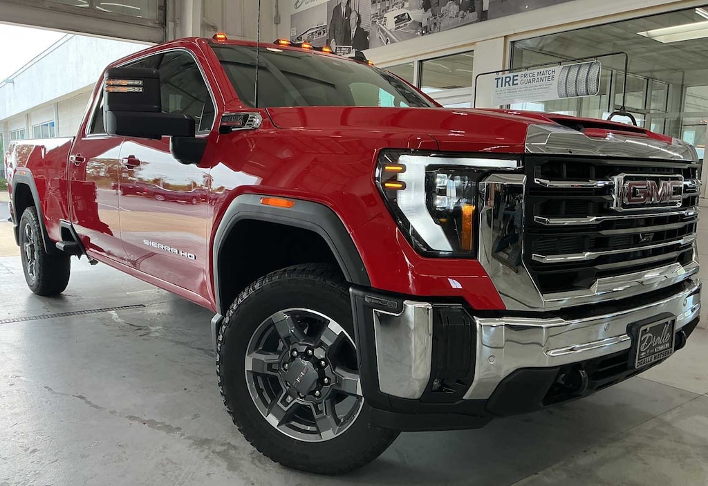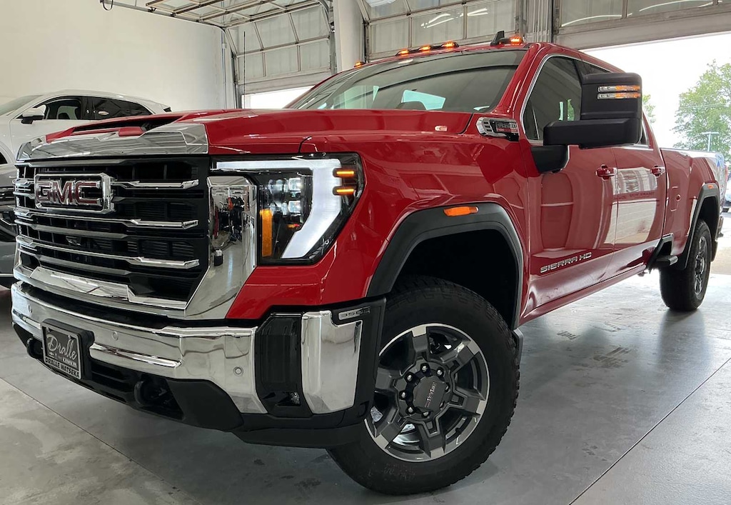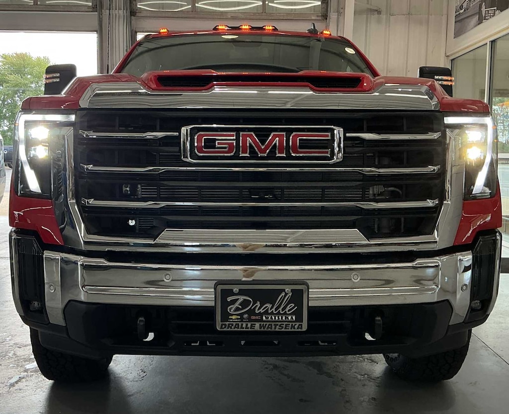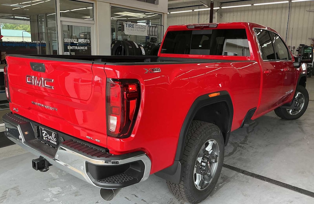 ENGINE, DURAMAX 6.6L TURBO-DIESEL V8, B20-DIESEL COMPATIBLE (470 hp [350.5 kW] @ 2800 rpm, 975 lb-ft of torque [1322 Nm] @ 1600 rpm) (Includes (K05) engine block heater.), SLE VALUE PACKAGE includes (PCQ) SLE Convenience package, (CGN) Bedliner, Spray-on, (ZM9) SLE Heated Package and (B59) Remote start package, PREFERRED PACKAGE includes (UET) In-Vehicle Trailering App, (PZ8) Hitch Guidance with Hitch View, (KSG) Adaptive Cruise Control, (UF2) cargo bed LED lighting, (UG1) Universal Home Remote and (A48) rear sliding power window Crew Cab models include (R7O) Cloth Rear Seat Storage Package.), SIERRA HD PRO SAFETY PLUS PACKAGE includes (UKV) Trailer Side Blind Zone Alert, (UFG) Rear Cross Traffic Alert and (UD5) Front and rear park assist; Crew Cab and Double Cab models include (UVN) Bed View Camera, (UV2) HD Surround Vision and (TRG) Trailer Camera Provisions (Includes (UET) In-Vehicle Trailering App. GOOSENECK / 5TH WHEEL PREP PACKAGE -- Hitch platform to accept Gooseneck or 5th Wheel hitch. Includes hitch platform with tray to accept ball, stamped bed holes with removable caps installed and bed mounted 7-pin trailer harness (similar to UY2 harness). (Includes (CGN) Bedliner, Spray-on. SLE CONVENIENCE PACKAGE includes (CJ2) dual climate control, (A2X) 10-way power driver seat including power lumbar, (N37) manual tilt/telescoping steering column and (T3U) LED fog lights; Single rear wheel models also include (U01) Roof Marker Lamps, X31 OFF-ROAD AND PROTECTION PACKAGE includes (X31) Off-Road suspension with Twin-tube Rancho shocks, (JHD) Hill Descent Control and (NZZ) skid plates (transfer case and oil pan), (CGN) Bedliner, Spray-on, (RIA) All-weather floor liners, LPO and X31 badge (replaces "4X4" badge on bed) Includes (PXD) 18" machined aluminum wheel with Dark Grey metallic accents and (QF6) LT275/70R18E all-terrain, blackwall tires. REMOTE START PACKAGE includes (BTV) Remote Start, (UTJ) content theft alarm and (C49) rear-window defogger, MIRRORS, OUTSIDE POWER-ADJUSTABLE VERTICAL TRAILERING WITH HEATED AND AUTO-DIMMING UPPER GLASS lower convex mirrors, turn signal indicators, puddle lamps, (U12) perimeter lighting, auxiliary lighting, power folding/manual extending (extends 3.31" [84.25mm]), Black Includes Perimeter Lighting and (DD8) auto-dimming rearview mirror.), TAILGATE, GMC MULTIPRO TAILGATE with six functional load/access features. NOTE: Auto release can be disabled if ball hitch is installed. See Owner's manual for details, SLE HEATED PACKAGE includes (KA1) heated driver and passenger seats, (KI3) heated steering wheel, AUDIO SYSTEM, 13.4" DIAGONAL PREMIUM GMC INFOTAINMENT SYSTEM with Google built in apps such as navigation and voice assistance, includes color touch-screen, multi-touch display, AM/FM stereo, Bluetooth® streaming audio for music and most phones; featuring wireless Android Auto® and Apple CarPlay® capability for compatible phones. (STD), TRANSMISSION, 10-SPEED AUTOMATIC. GMC SLE with Cardinal Red exterior and Jet Black interior features a 8 Cylinder Engine with 470 HP at 2800 RPM*.
