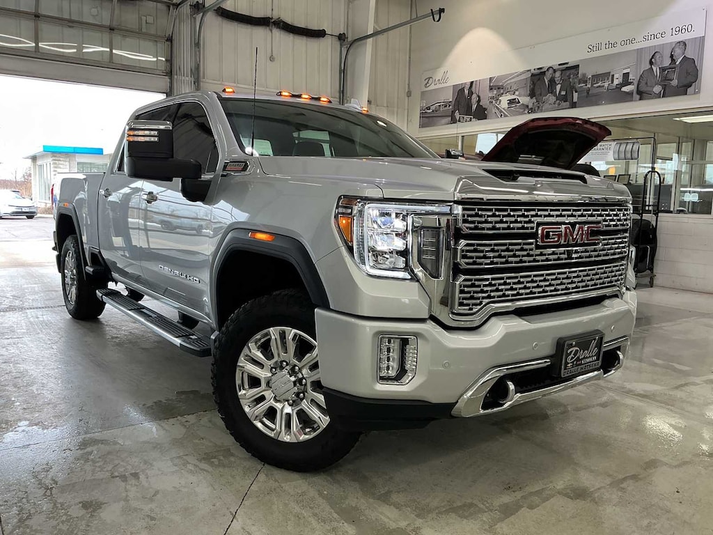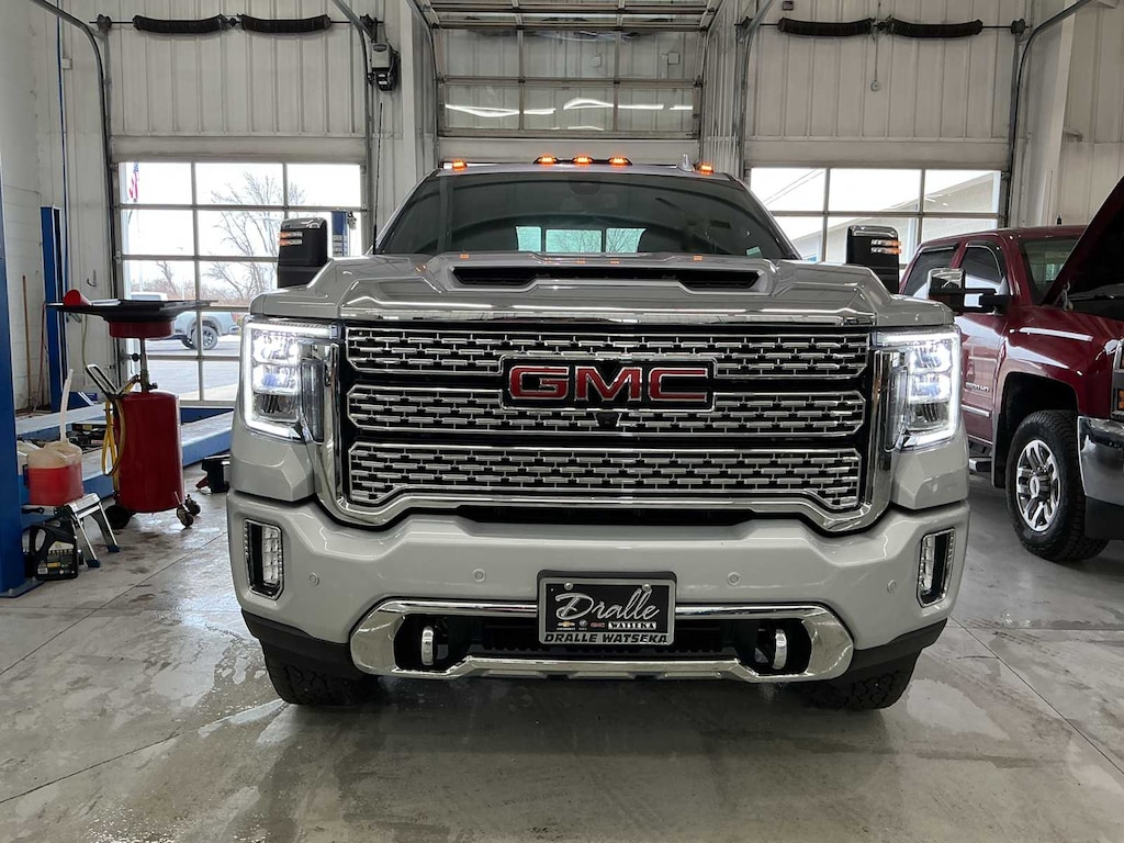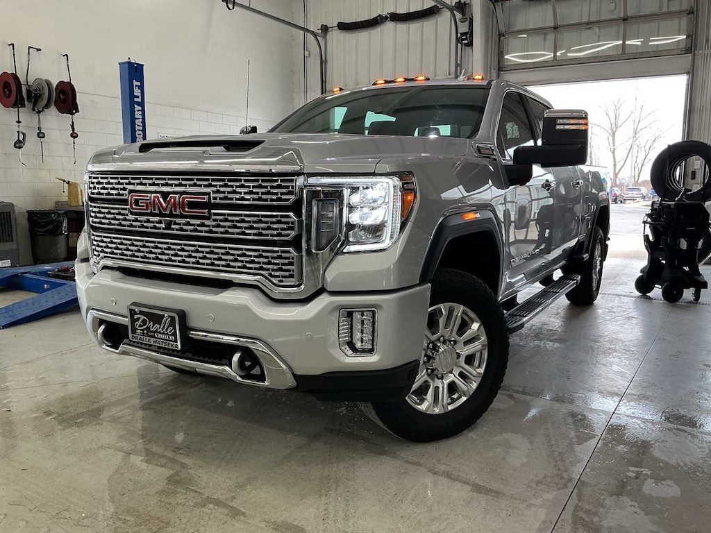 ENGINE, DURAMAX 6.6L TURBO-DIESEL V8, B20-DIESEL COMPATIBLE (445 hp [332 kW] @ 2800 rpm, 910 lb-ft of torque [1220 Nm] @ 1600 rpm) (Includes (K05) engine block heater.), GOOSENECK / 5TH WHEEL PREP PACKAGE -- Hitch platform to accept Gooseneck or 5th Wheel hitch. Includes hitch platform with tray to accept ball, stamped bed holes with removable caps installed and bed mounted 7-pin trailer harness (similar to UY2 harness). AUDIO SYSTEM, PREMIUM GMC INFOTAINMENT SYSTEM WITH NAVIGATION AND 8" DIAGONAL COLOR TOUCH-SCREEN includes multi-touch display, AM/FM stereo, Bluetooth® streaming audio for music and most phones; featuring wireless Android Auto® and Apple CarPlay® capability for compatible phones, advanced voice recognition, in-vehicle apps, personalized profiles for infotainment and vehicle settings. Includes greater memory. (STD) (Includes (PZ8) Hitch Guidance with hitch view.), TRANSMISSION, ALLISON 10-SPEED AUTOMATIC. GMC Denali with QUICKSILVER METALLIC exterior and DARK WALNUT / DARK ASH GREY interior features a 8 Cylinder Engine with 401 HP at 5200 RPM*.
